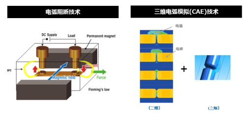 ● 通过在接点附近配置永久磁铁的磁场延长直流电流阻断时在继电器接点间产生的放电电弧长度*4的 电弧阻断技术*1,可切实且安全地阻断高容量直流电流。