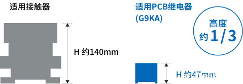 为了解决这个发热课题而开发的产品便是G9KA型高容量功率继电器。G9KA在行业内实现低接触电阻0.2mΩ,有效抑制了作为小型化、高容量化重大课题的发热。此外,与同等电流容量的接触器相比,高度采用只有其1/3左右的紧凑型尺寸,有助于实现设备的小型化、省空间化。