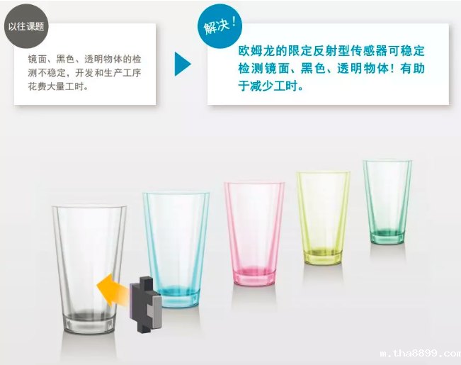 欧姆龙限定反射型传感器的原理:接受来自检测物体的反射光以检测物体有无。拥有限定了投光光束和受光区域的光学系统,仅可检测相距传感器一定距离(投光光束与受光区域重合的范围)的检测物体。