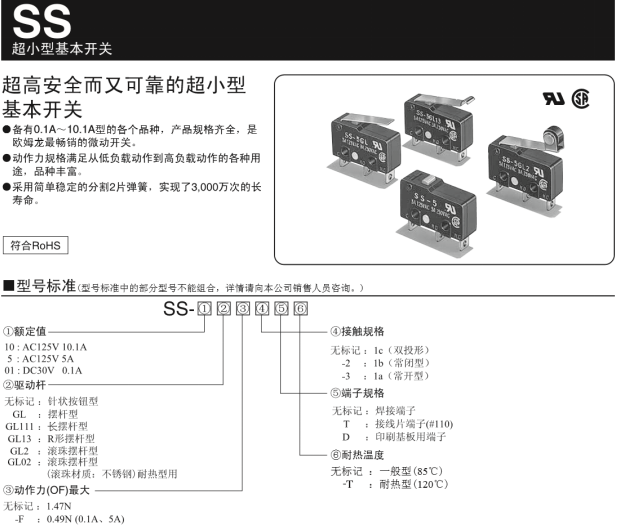 所以,对于微动开关品牌的选择还是不能马虎的,鼎悦小编为您推荐世界知名品牌欧姆龙微动开关:具有超高安全、超长寿命、超小尺寸的微动开关SS系列。 具体技术参数: