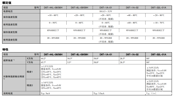 MEMS非接触式温度传感器的额定值/特性: