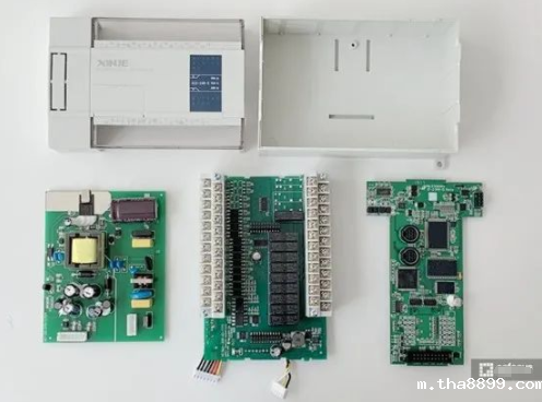 PLC 在 PCB 设计上分为了 3 个板子,从左至右分别为电源板、IO 口板以及主控板。