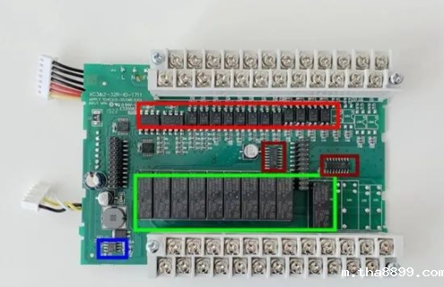 其次,这 IO 接口板上我们也可以发现此 PLC 是基于继电器的输出,这里的话采用的欧姆龙的继电器(型号为 G5NB-1A-E-DC24<绿色>