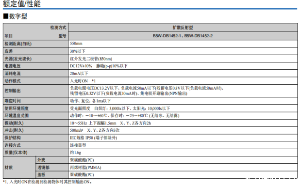欧姆龙B5W-DB采用集电极(NPN)开路输出,电源电压DC12V,消耗电流可达到20mA以下,即使在较低的功耗下,也可实现高性能。并且与同类产品相比,B5W-DB不易受到环境光的影响。