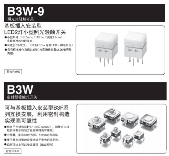 首先来聊聊什么商用饮水机上可以用我们欧姆龙的哪些产品,这里小编给大家推荐可以应用在饮水机上面欧姆龙的轻触开关,B3W防水系列和B3W-9带灯的系列,都可应用。