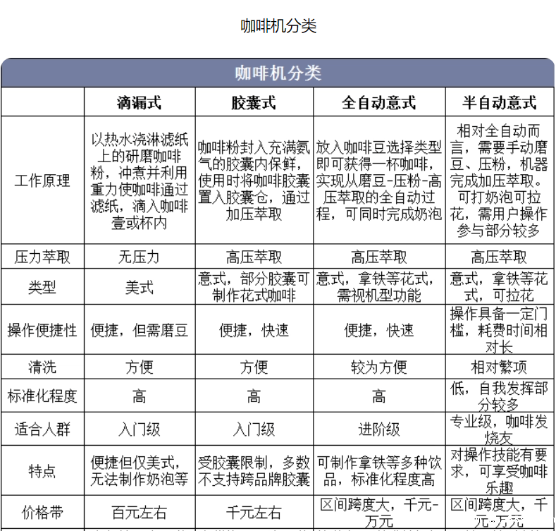 人们把电子技术应用到咖啡机上,实现了磨粉、压粉、装粉、冲泡、清除等酿制咖啡全过程的自动控制,创造了咖啡机。具体分品类来看,咖啡机根据萃取方式可主要分为滴漏式、胶囊式和压力式(意式),根据工作方式可分为全自动和半自动(区别在于半自动需要消费者掌握一定的咖啡技能,磨豆、压粉、打奶泡等多项步骤需手动参与)。