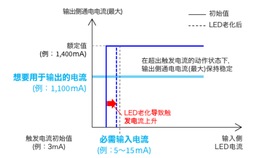 晶体管耦合器在增大输入侧电流时,输出侧电流也会变大,所以与MOS FET继电器相比,会消耗更多的电力。LED老化会使输出也跟随减弱,由此需要更多的电力;