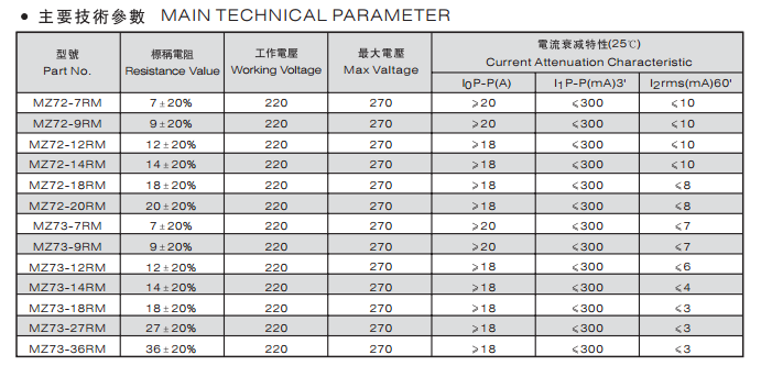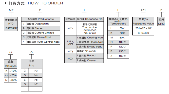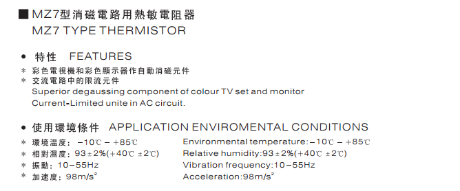 PTC热敏电阻器:是一种以钛酸钡为主要成分的半导体陶瓷元件,当温度增加到居里温度以上时,其电阻值呈阶跃式增加,可达到4~10个数量级。它具有电阻值随温度的增加而增加的特性。其中MZ2型热敏电阻器由于过流保护作用而用于通讯及交流电路中。MZ3型热敏电阻器具有延长灯丝寿命及节约能源而用于电子节能灯及电子镇流器,用于数字式万用表中作过流保护元件、交流电路中过热保护。MZ9型马达启动热敏电阻器可作为无触点开关用于制冷设备的压缩机及大功率马达中。MZ7型消磁电路用热敏电阻器,在彩色电视机和彩色显示器作自动消磁元件,