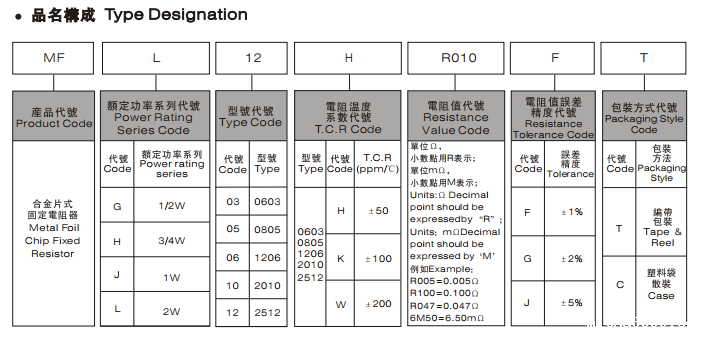 合金片式固定电阻器 MFL12HR010FT