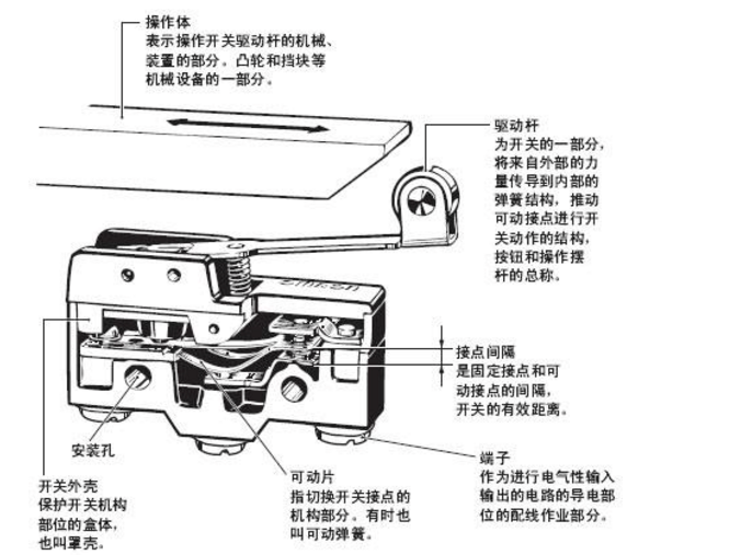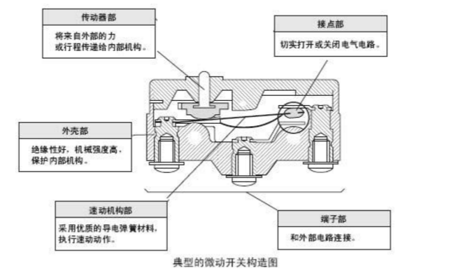微动开关具有微小接点间隔和速动机构,用规定的行程和力进行开关动作的接点机构,被外壳覆盖, 其外部有传动器,且外形较小。下图为典型的微动开关构造的一个示例。