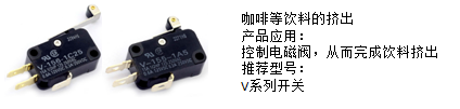 (4)产品推广四:咖啡等饮料的挤出,推荐使用欧姆龙大容量V系列微动开关,用于控制电磁阀,实现饮料挤出的功能: