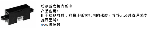 (5)产品推广五:检测贩卖机内残渣,推荐使用欧姆龙B5W传感器,用于检测咖啡、鲜橙汁贩卖机内的残渣,并提示及时清理残渣: