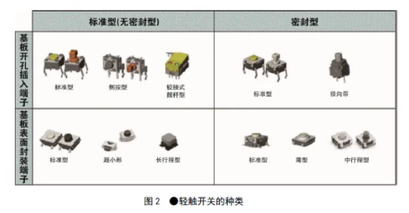 轻触开关首先可以分为标准型(无密封型)和密封型。和微动开关一样,密封型轻触开关采取了防水、防尘措施,在环境恶劣的场所也能使用。其次,端子形状可以分为两种,一种是可以将端子插入印刷基板上的孔中的基板开孔插入端子,另一种是可以焊接在基板表面的基板表面封装端子,还有根据用途加工成特殊形状及规格的产品,比如从侧面进行操作的侧按型、操作行程较长的长行程型、外形只有米粒大小的超小型等等(图2)。