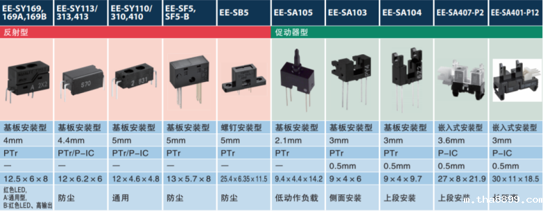 例如在打印机、智能设备、工业机械等设备上可以使用EE-SX1088,EE-SX1041,EE-SF5和EE-SX1081,这几款小体积槽型和对射式光电开关,驱动功耗低、灵敏度高,输出电流高低,超小的超宽。