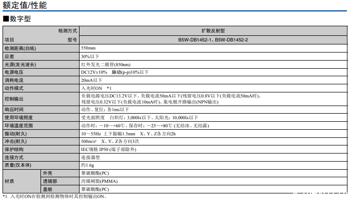 欧姆龙光电传感器B5W-DB的光源为红外发光二极管(850nm),受光面照度在白炽灯的情况下为3,000lx以下、太阳光的照度下为10,000lx以下。不仅如此,B5W-DB的外壳采用聚碳酸酯(PC)、透镜部采用丙烯树脂(PMMA)、盖板采用聚碳酸酯(PC)材质,保护结构符合IEC规格IP50标准(端子部除外),可帮助设备实现强耐用性。
