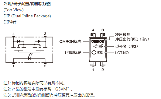 * 连续负载电流 (最大)、 负载电压 (最大) : 表示峰值AC、 DC。 注1. 带状包装(表面安装端子型) 无标准在库机种。 注2. 带状包装(表面安装端子型) 的订货请在型号末尾加上(TR) 或(TR05)。 |