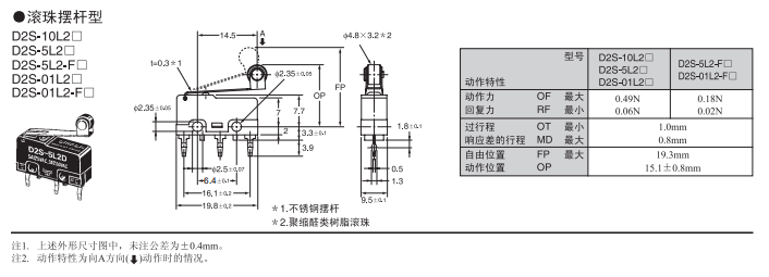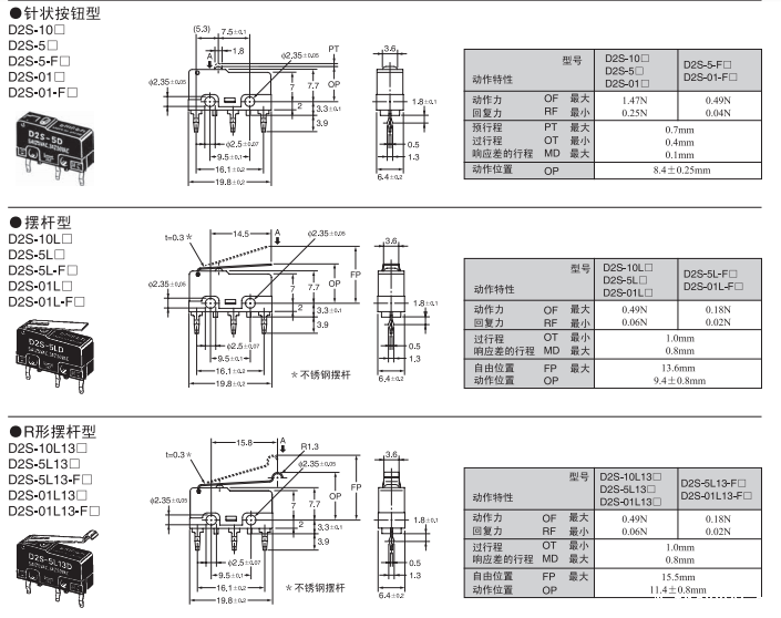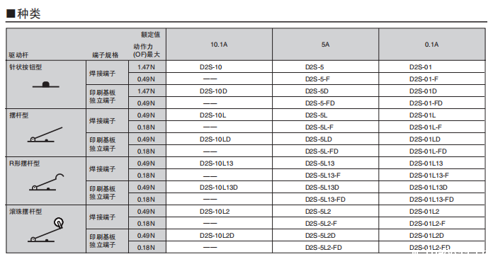 具有较好的耐焊剂性的超小型系列 焊剂无法进入的一体成型端子结构。 动作位置(OP)的精度高达±0.25mm,周边设计和定位简单。 采用了横向操作中也能方便动作的针状按钮型。