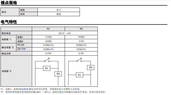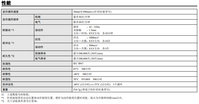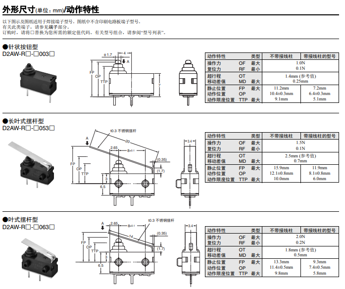 内置电阻,可检测4种状态 长行程密封型开关 开关 ON/OFF/短路/断线 输出4种状态 即使无摆杆也便于使用的长行程规格 (OT参考值:1.4mm) 凭借滑动接点结构实现高接触可靠性和安静的动作音
