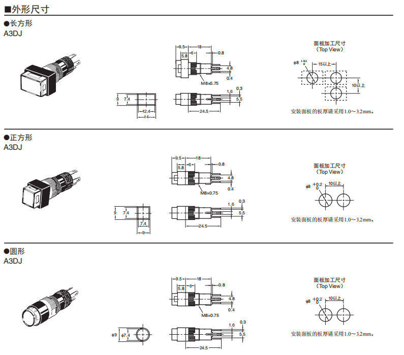 躯干长18mm、 圆躯干型f8系列 ●高亮度的均一表面发光。 ●圆形便于开孔。 ●形状小巧,操作感好。
