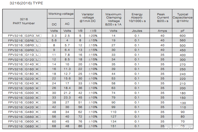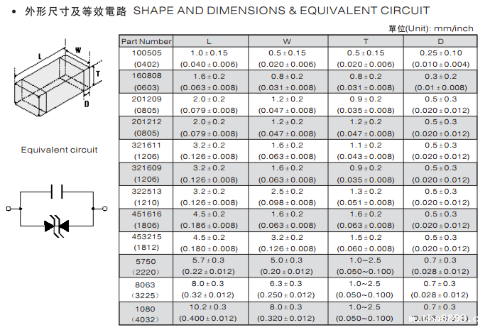 特征: 1、叠层片式陶瓷结构。 2、无引线。 3、温度范围:-55℃~+125 ℃。 4、工作电压范围V w(dc)=3.3~ 615V。 5、具有双向限制特性,适合ESD保护。 6、漏电流非常小。 7、寄生电感小、响应速度快(响应时间少于0.5ns)。 8、优良的温度系数。 9、良好的焊接性能(端电极为三层电镀)。 应用: 1、防止过电压:当施加的电压升高到压敏电压时,压敏电阻器的电流急剧上升,被保护设备的浪涌电压迅速减小,从而使装有压敏电阻器的设备抗浪涌噪声能力达到相应要求。压敏